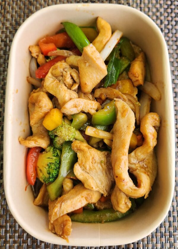 Kipreepjes met groenten in een milde oestersaus.