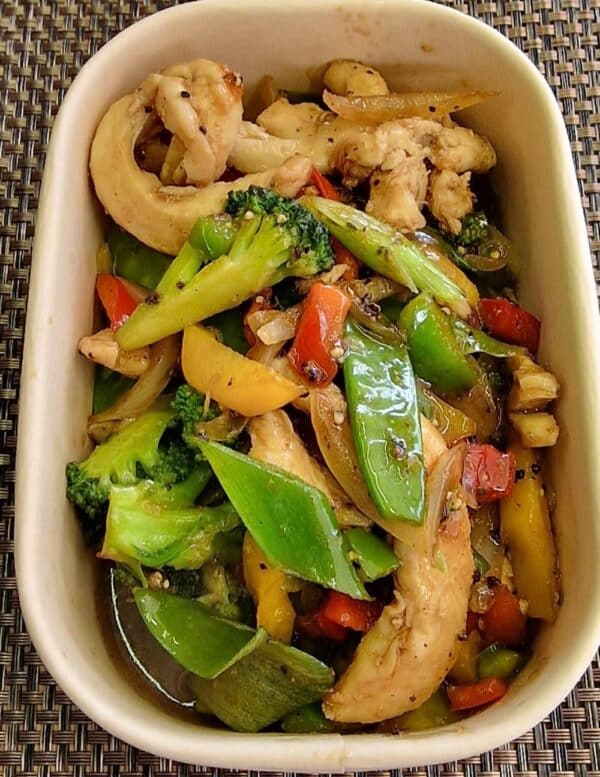 Kipfilet met groenten en zoete, licht pittige, zwarte pepertjes.
