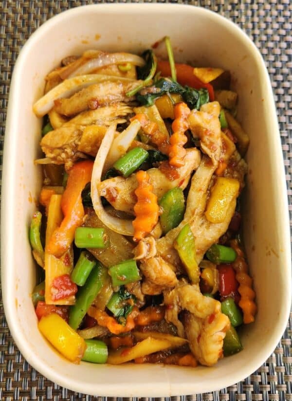 Kipreepjes en groenten uit de wok met basilicum en pittige chili pepertjes.