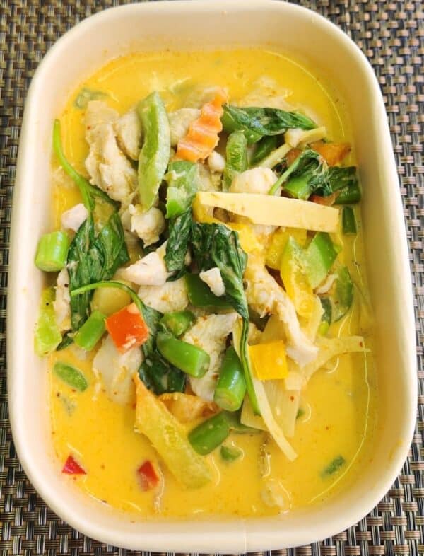 Reepjes kip met groenten in een rode curry en kokosmelk.