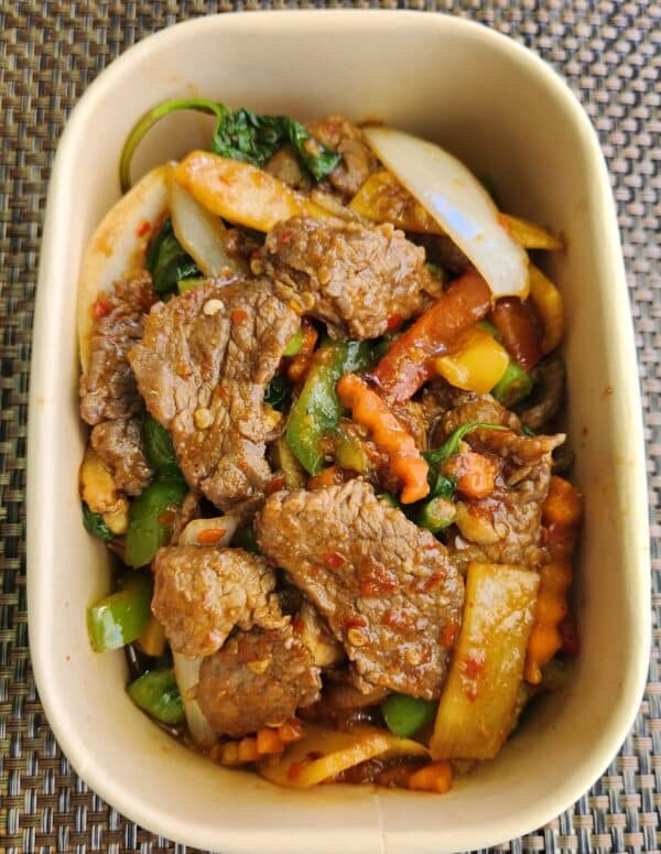 Een traditioneel pittig Thais gerecht met biefstukjes, groenten, basilicum en verse chili-pepertjes.