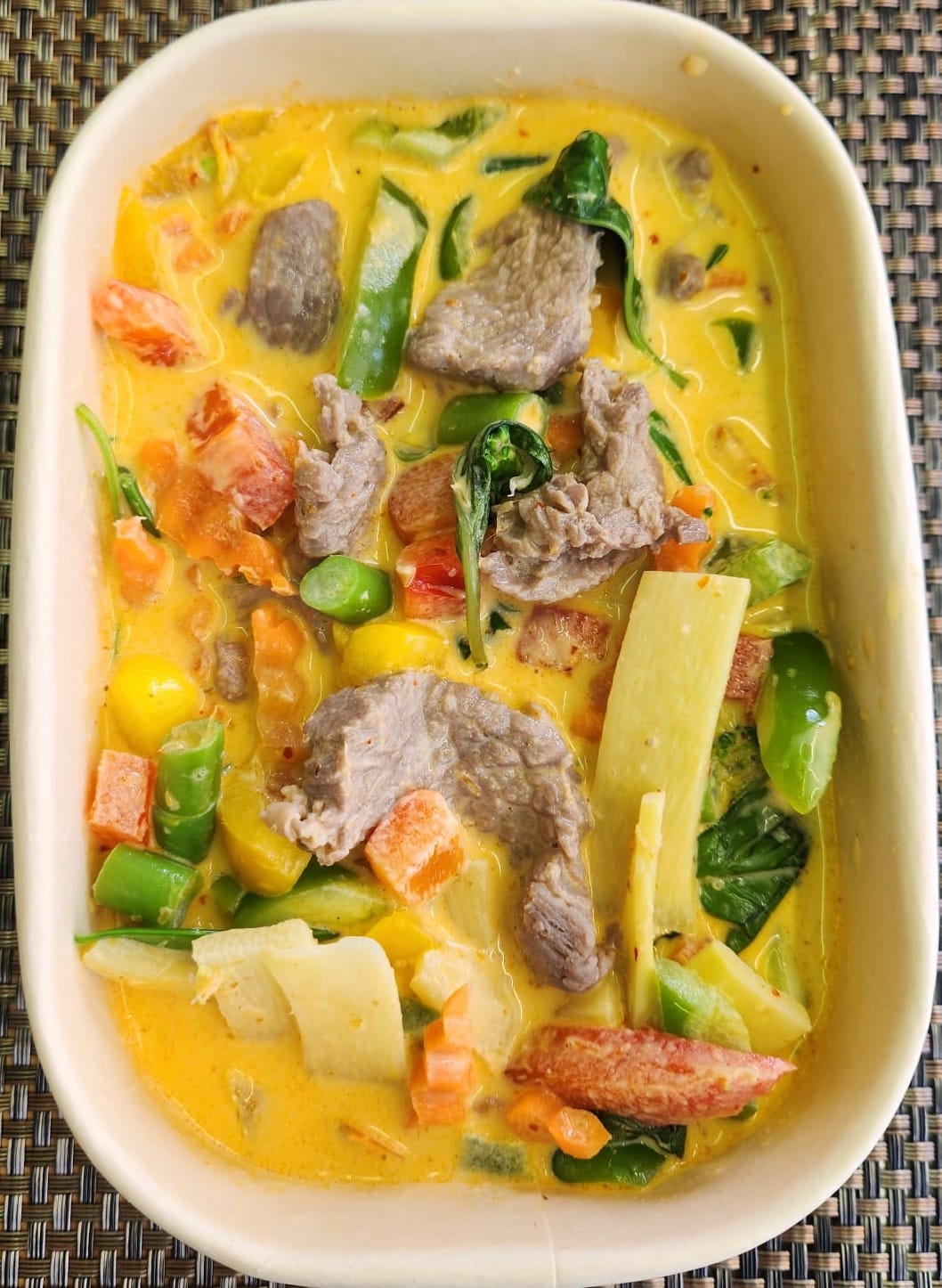 Reepjes biefstuk en groenten met een rode currysaus in een romige kokosmelk.