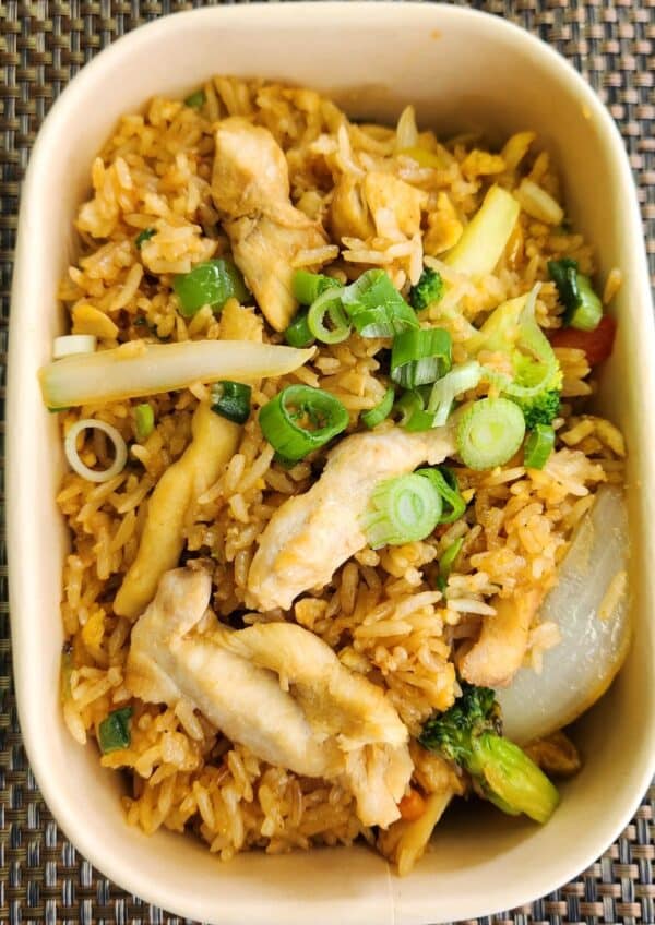 Gebakken rijst, groenten en kipreepjes met heerlijke Thaise kruiden.