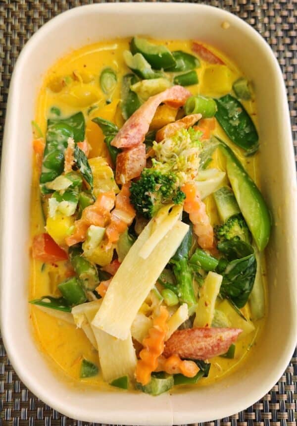 Groenten en een licht pittige rode curry in een romige kokosmelk