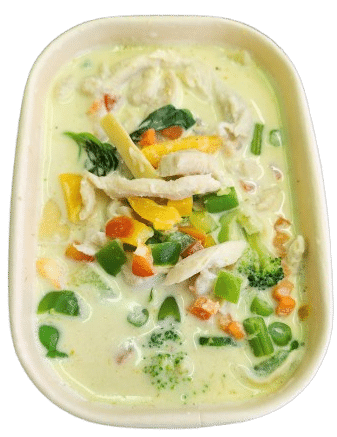 Reepjes kip met veel verse groenten in eengroene curry en romige kokosmelk.