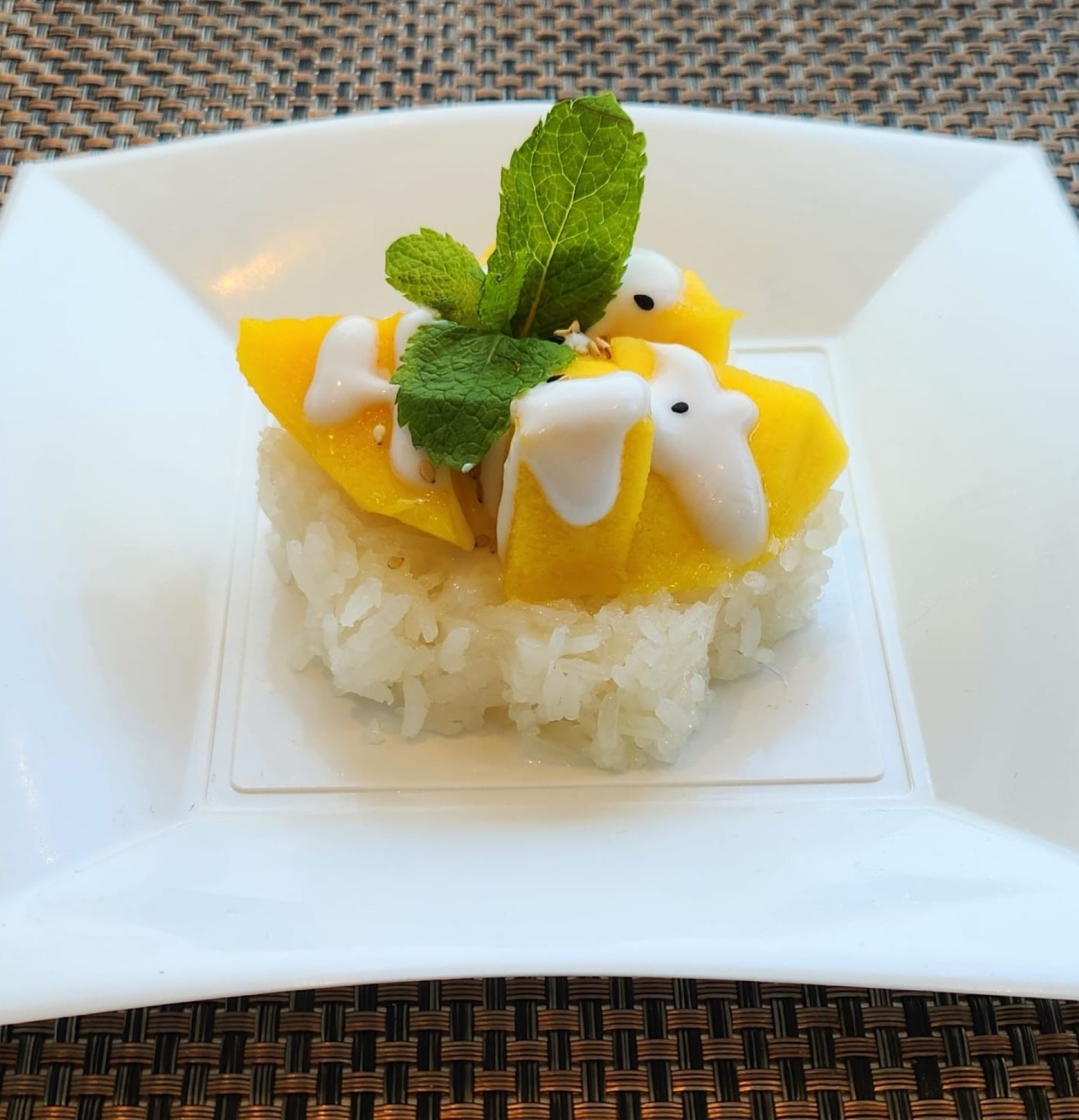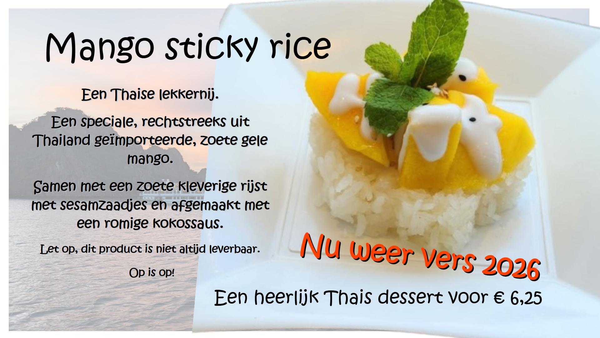 Het mango seizoen 2026 is begonnen!!! Een echte Thaise lekkernij. Zoete “sticky rice” met een halve gele mango.